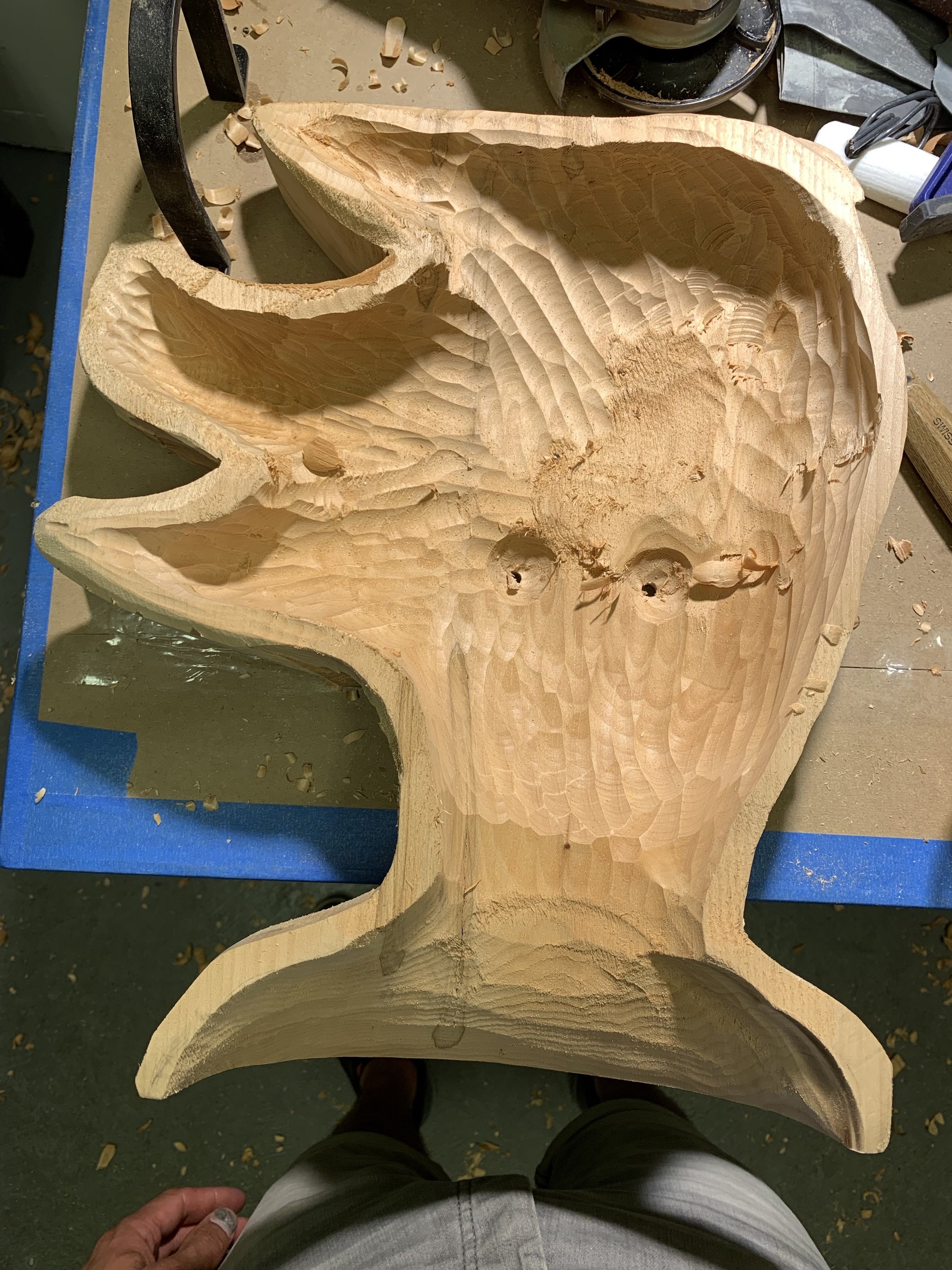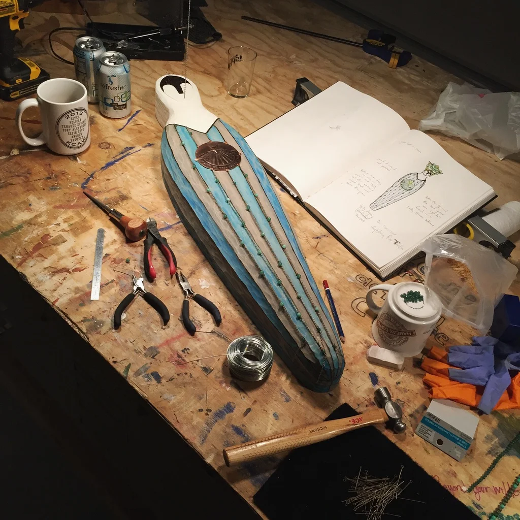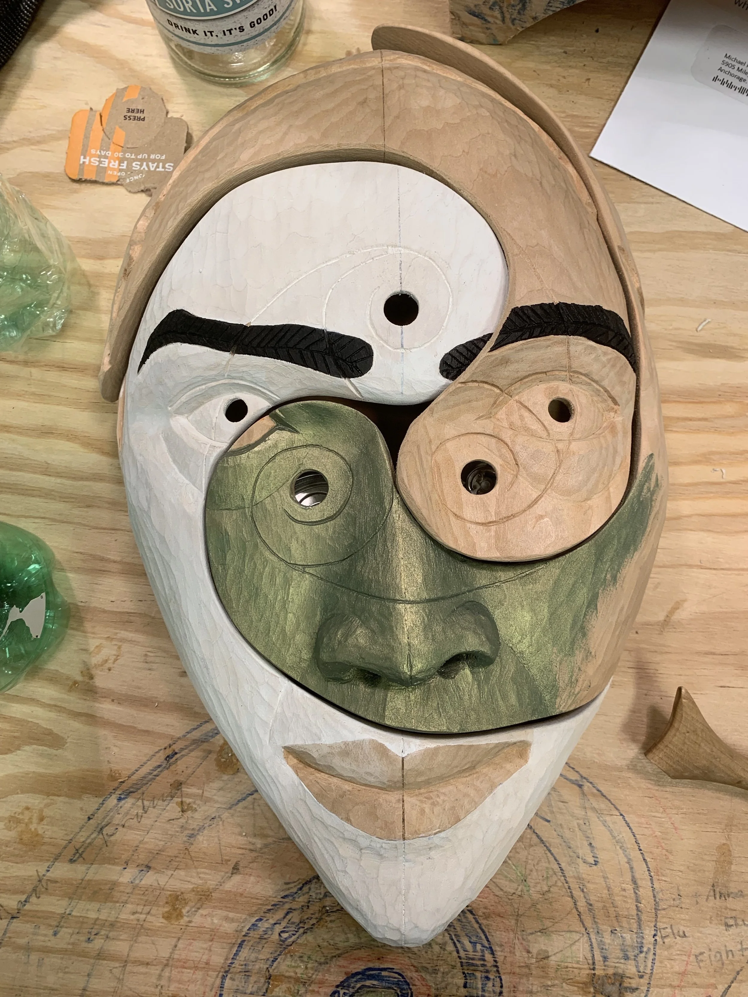 Building a Resiliency Mask for Cook Inlet Tribal Council. Built after the large earthquake that created water damage on much of the building. I was asked to create a piece that told a story of resiliency. I thought about how we all carry our values though our lives and this is our culture, it keeps us alive. That is our resiliency.